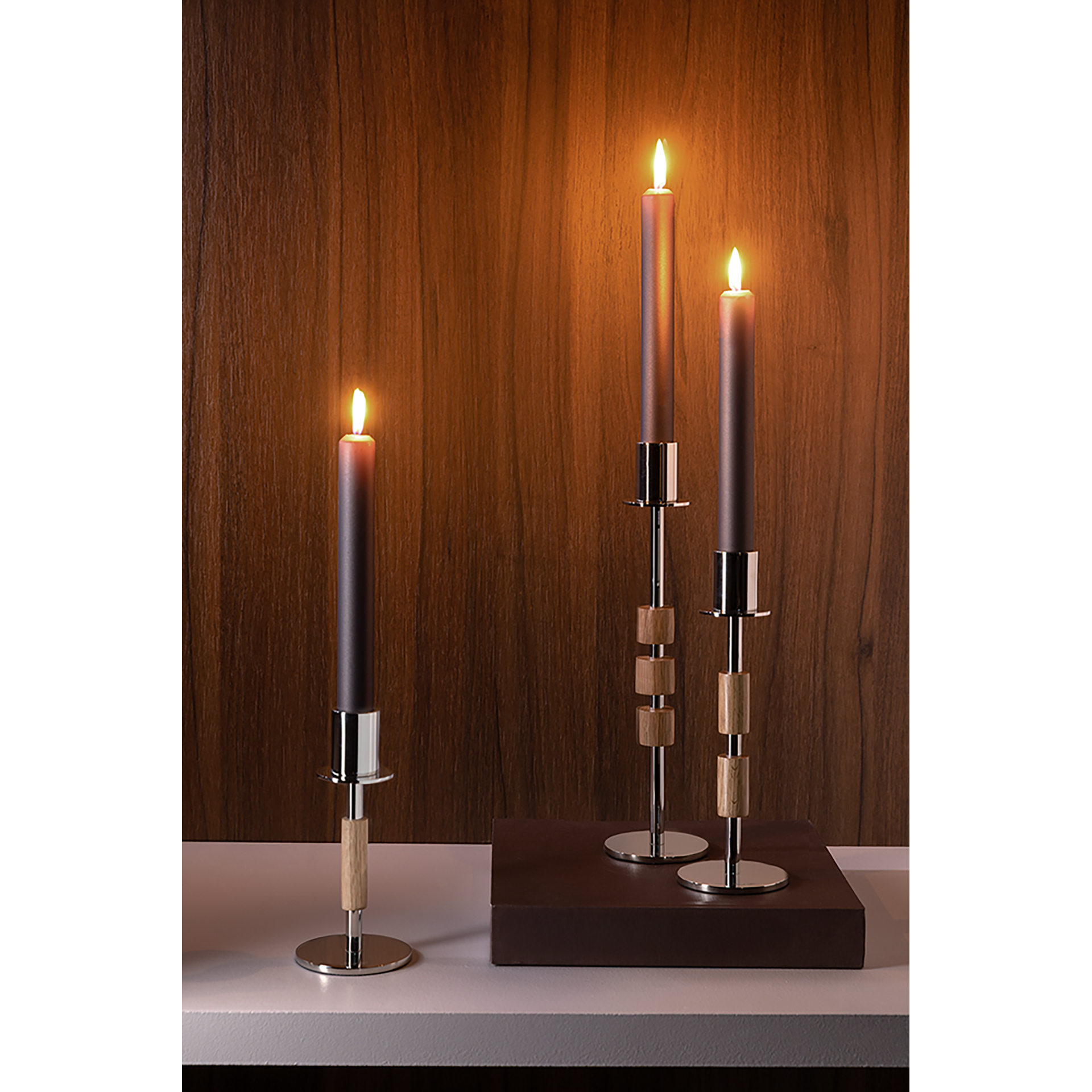PORTERO vereint geradliniges Design mit natürlicher Wärme. Die hellen Eichenholzelemente setzen einen spannenden Kontrast zur glänzenden Metalloberfläche. In drei Höhen erhältlich, fügt sich der Leuchter harmonisch in jedes Ambiente ein – mal minimalistisch, mal als besonderer Akzent lassen sie sich spielerisch untereinander arrangieren. Die Kombination aus kühler Eleganz und lebendiger Natürlichkeit macht PORTERO einzigartig. Ob als stilvolle Einzelstatement oder im Ensemble, dieser Leuchter bringt Licht und Charakter in den Raum – zeitlos, modern und individuell. Jedes einzelne Stück wird in aufwendiger, traditioneller Handarbeit gefertigt und es entstehen individuelle Unikate, die ihre ganz eigene Herstellungsgeschichte besitzen.
