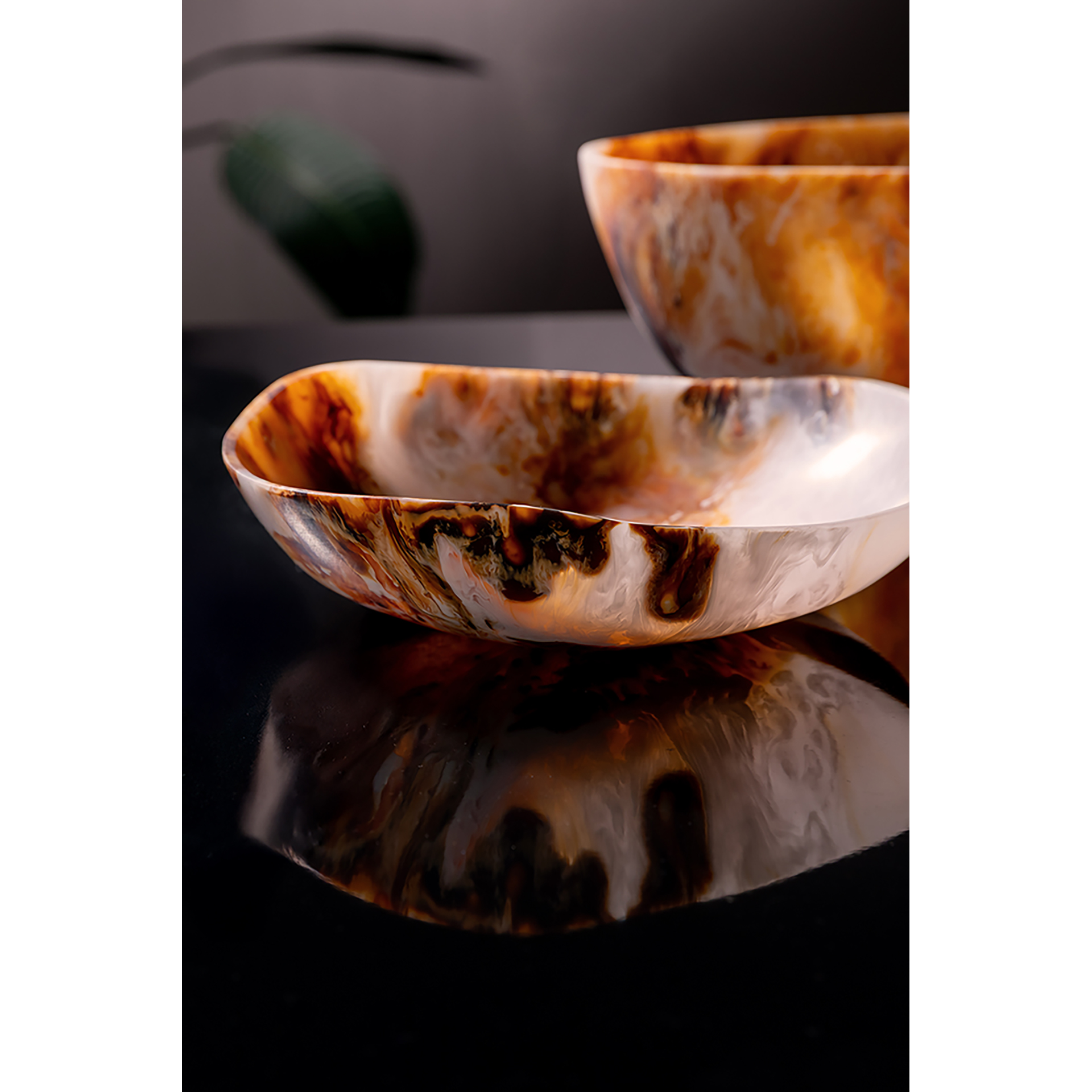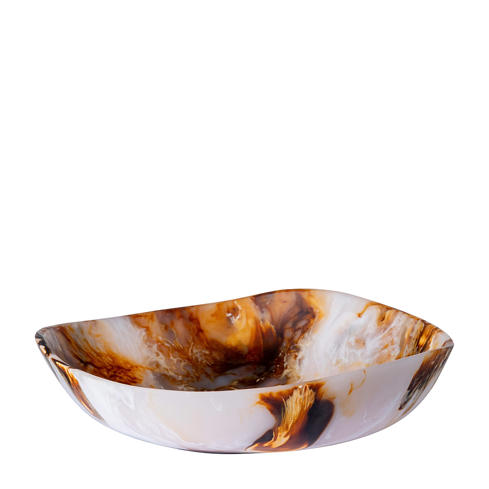 MEXICO ist ein Statement mit fließendem und mutigem Design. Das kunstvolle Wirbelmuster aus Amber, Braun und Weiß verschmilzt in aufregender Dynamik – jedes Stück ein Unikat. Die glänzend matte Resin-Oberfläche fängt Licht ein, betont Tiefe und Bewegung. Mal kraftvoll, mal sanft – die Farben tanzen wie eine warme Brise über die handgefertigte Form. Ein besonderer Akzent, der Charakter in jeden Raum bringt. MEXICO ist mehr als eine Schale – sie ist pure Leidenschaft in Design. Mit großem handwerklichem Geschick wird jedes einzelne Objekt in einem aufwendigen Herstellungsprozess gefertigt. Dank der individuellen Techniken wird jedes Stück zu einem unverwechselbaren Unikat mit besonderen charakteristischen Merkmalen.