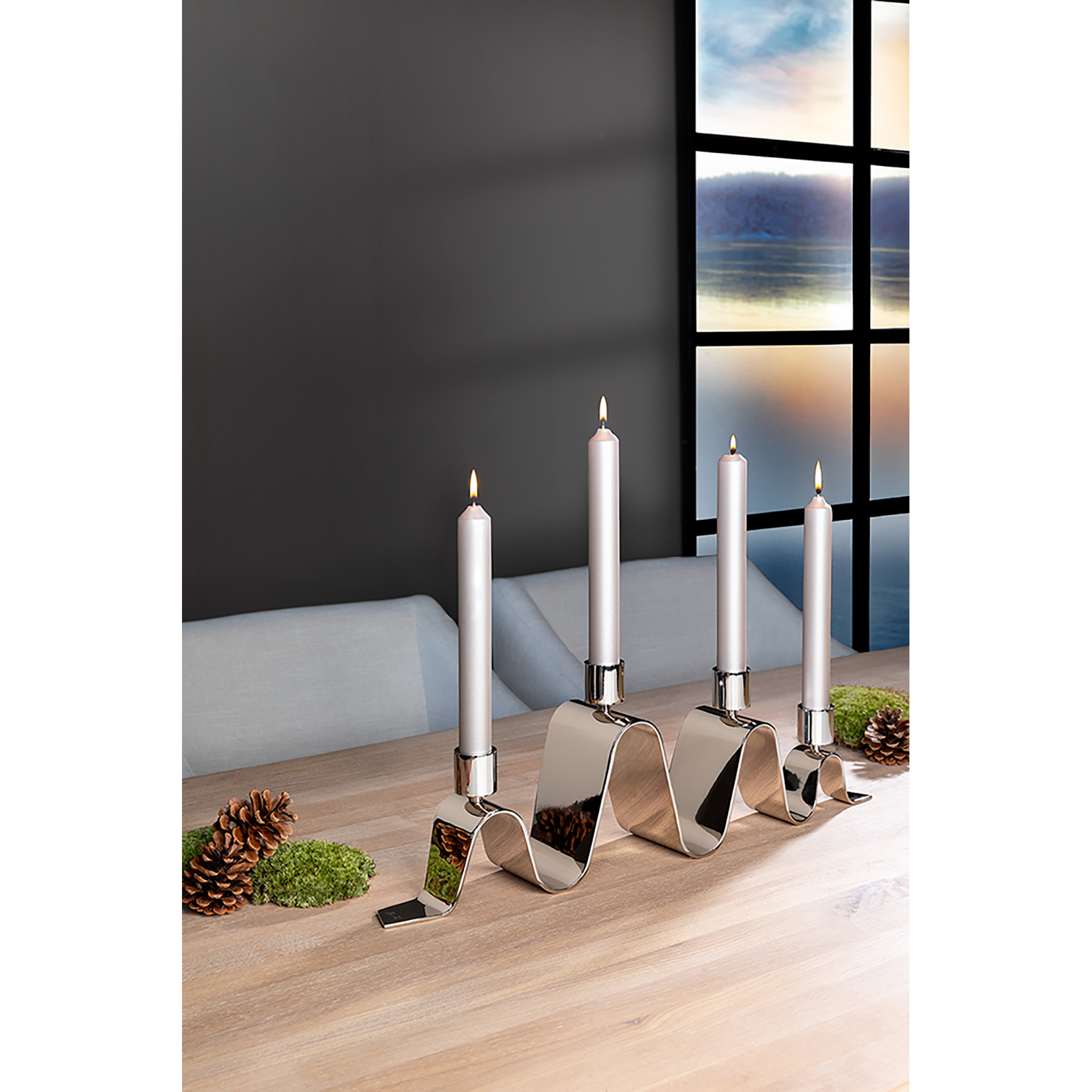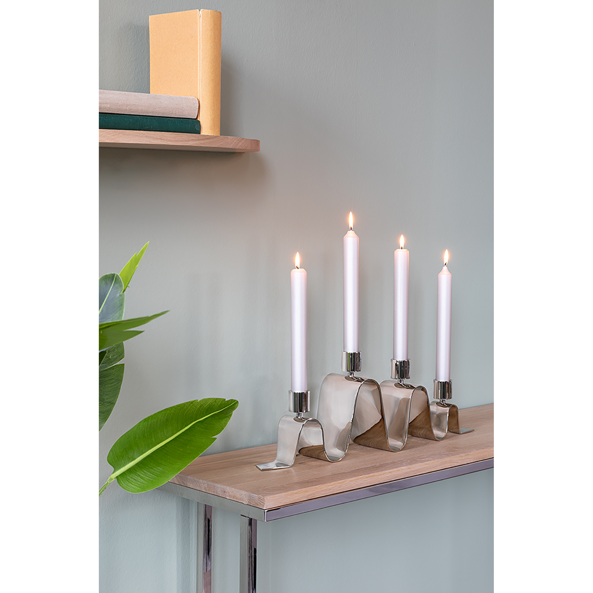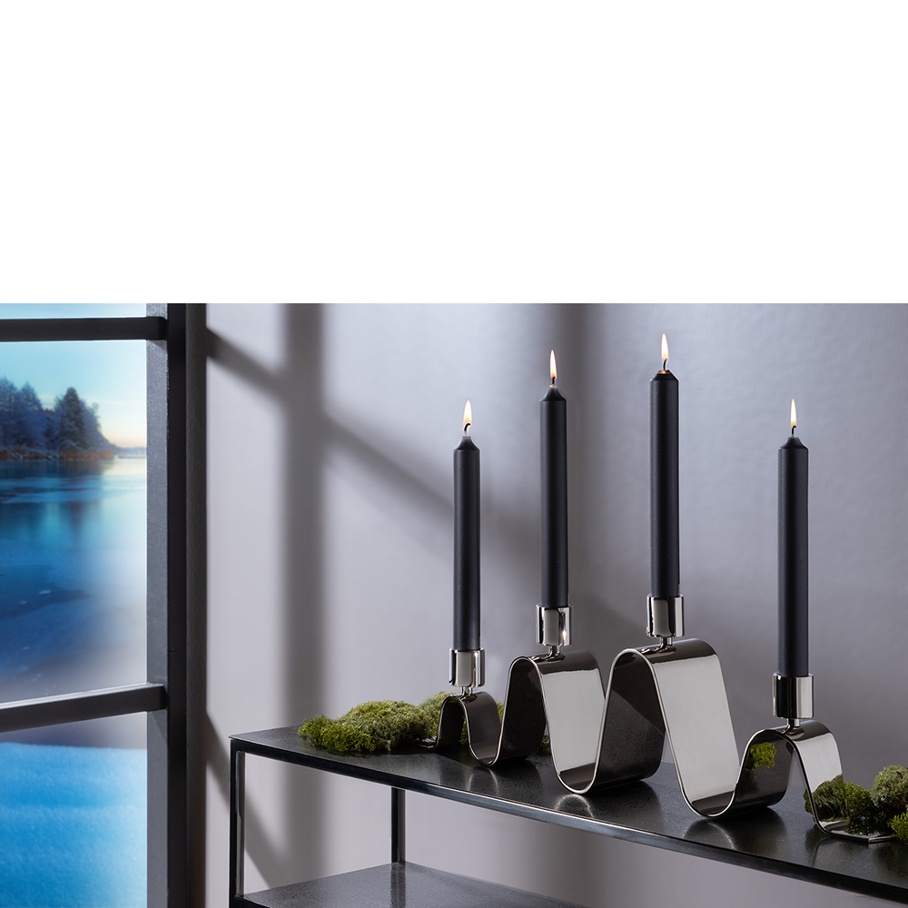 Stimmungsvolle Eleganz kann so einfach sein: Der Stabkerzenhalter HILARA vereint dynamische Wellenformen mit klarem Design und bringt so lebendigen Glamour in jeden Wohnraum. Das pflegeleichte Metall besticht durch strahlenden Glanz und macht das Wohnaccessoire besonders. HILARA ist ein außergewöhnlicher Blickfang auf jedem gedeckten Tisch und lockert mit seiner verspielten Formensprache jede Dekoration auf. Das Modell ist in zwei verschiedenen Ausführungen erhältlich, die abwechslungsreiche Arrangements ermöglichen. Jedes einzelne Stück wird in aufwendiger, traditioneller Handarbeit gefertigt und es entstehen individuelle Unikate, die ihre ganz eigene Herstellungsgeschichte besitzen.